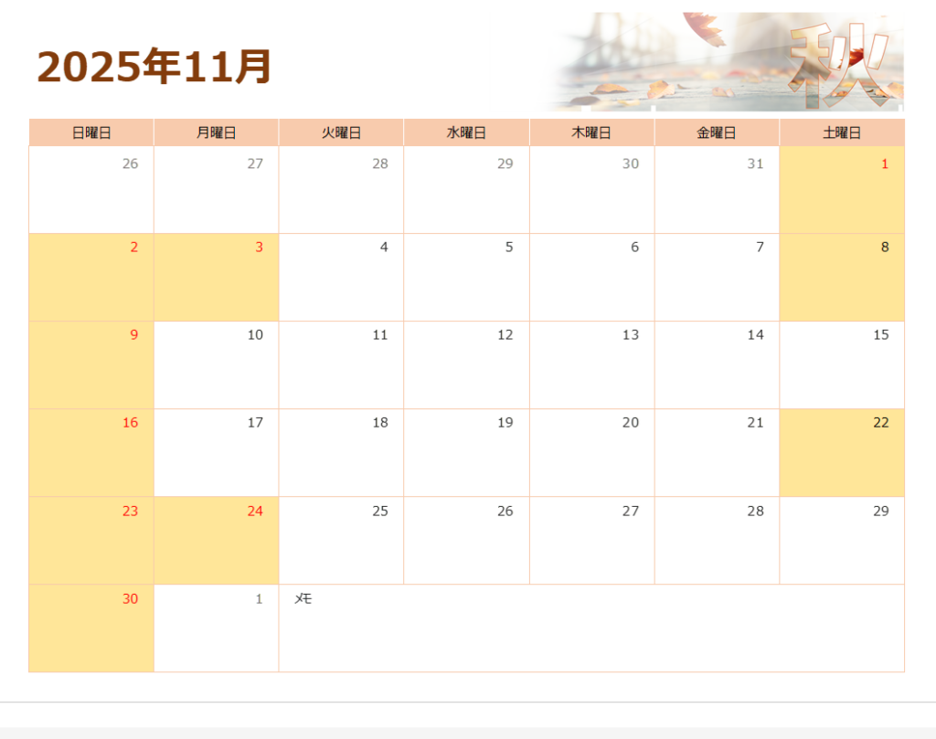 2025年11月休日カレンダー